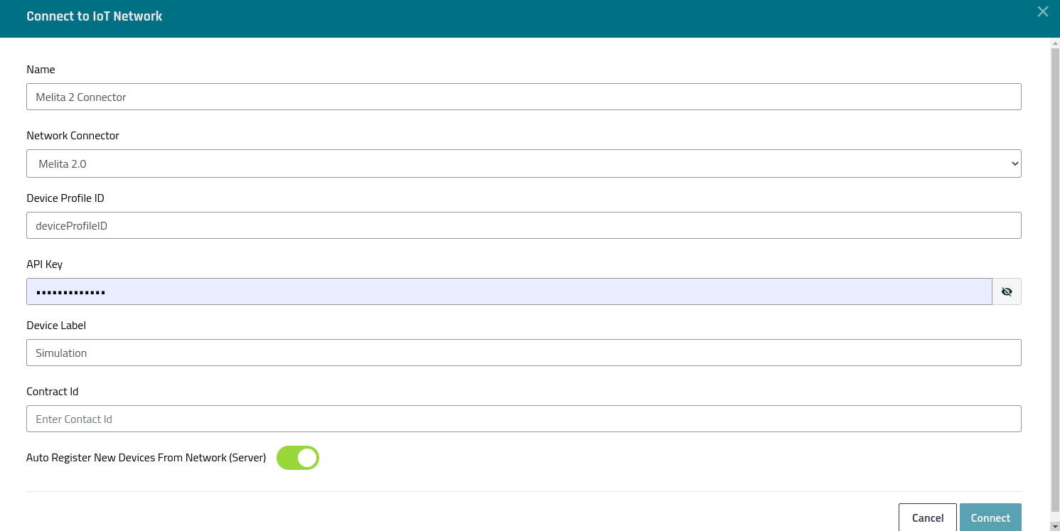 ![]() | SUPPORT FOR MELITA 2.0 New network connector has been added to support melita 2.0. The unique fields associated with the melita 2.0 connectors are: Device Profile ID, API Key, Device Label, Contract Id. |