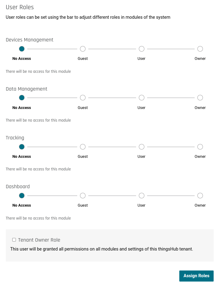 UPDATED USER ROLES ASSIGNMENT The roles can be easily assigned to any user from the user detail page. There are four categories, and four levels in each categories (as can be seen in the picture on the side). A Tenant Owner has Owner roles in all the categories. | ![]() |