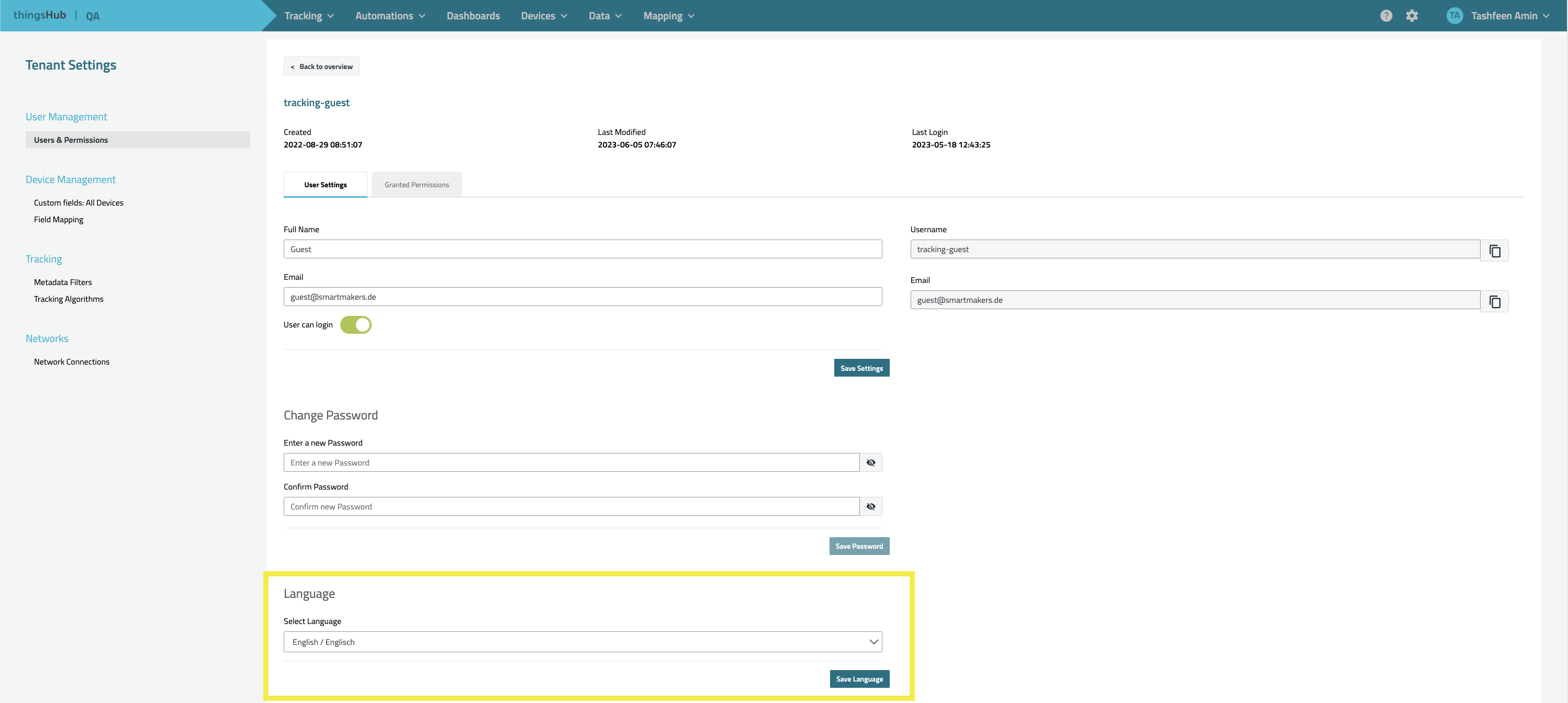 There is an option in user details to update the language preference of any user – as a tenant owner. The selected language will be set as the user logins of ThingsHub.