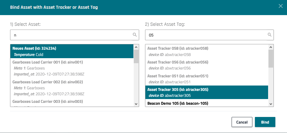 Step 2) In the Bind Asset with Asset Tracker or Asset Tag dialog, search for the asset by asset name, asset tag name, ID, or metadata. Once found, select the asset and the corresponding Asset Tag. Then press the Bind button to complete the connection.