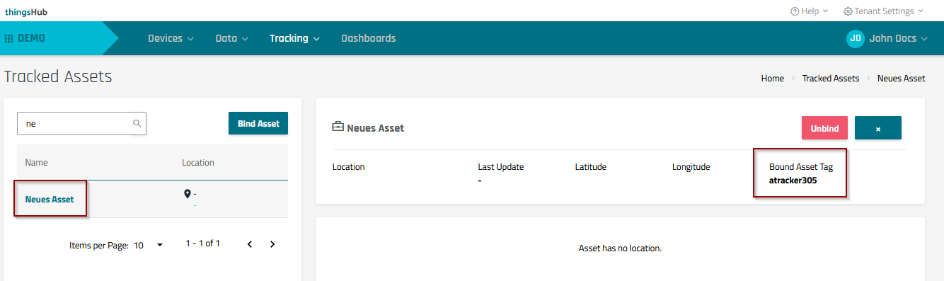 The tracking device must also be physically connected to the asset and networked to the thingsHub via an IoT network connection. This is the real-world counterpart to the binding process.