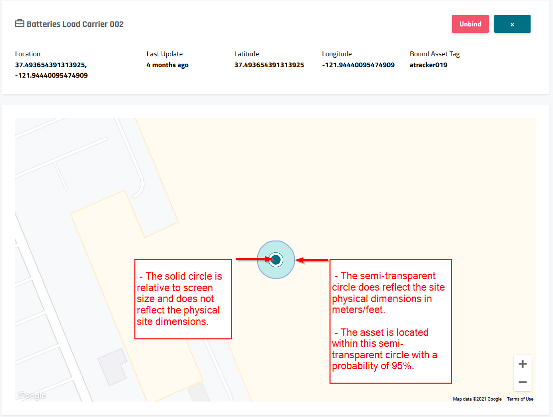 The semi-transparent circle is proportional to the site’s physical dimensions in meters/feet. The asset is located within this circle with a probability of 95%.
