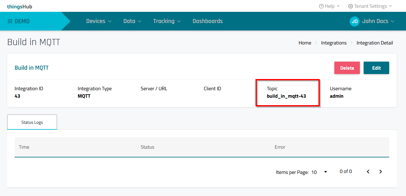 2) In the Integration Detail page, the topic is displayed as shown below. In the below example, the topic is build_in_mqtt-43.