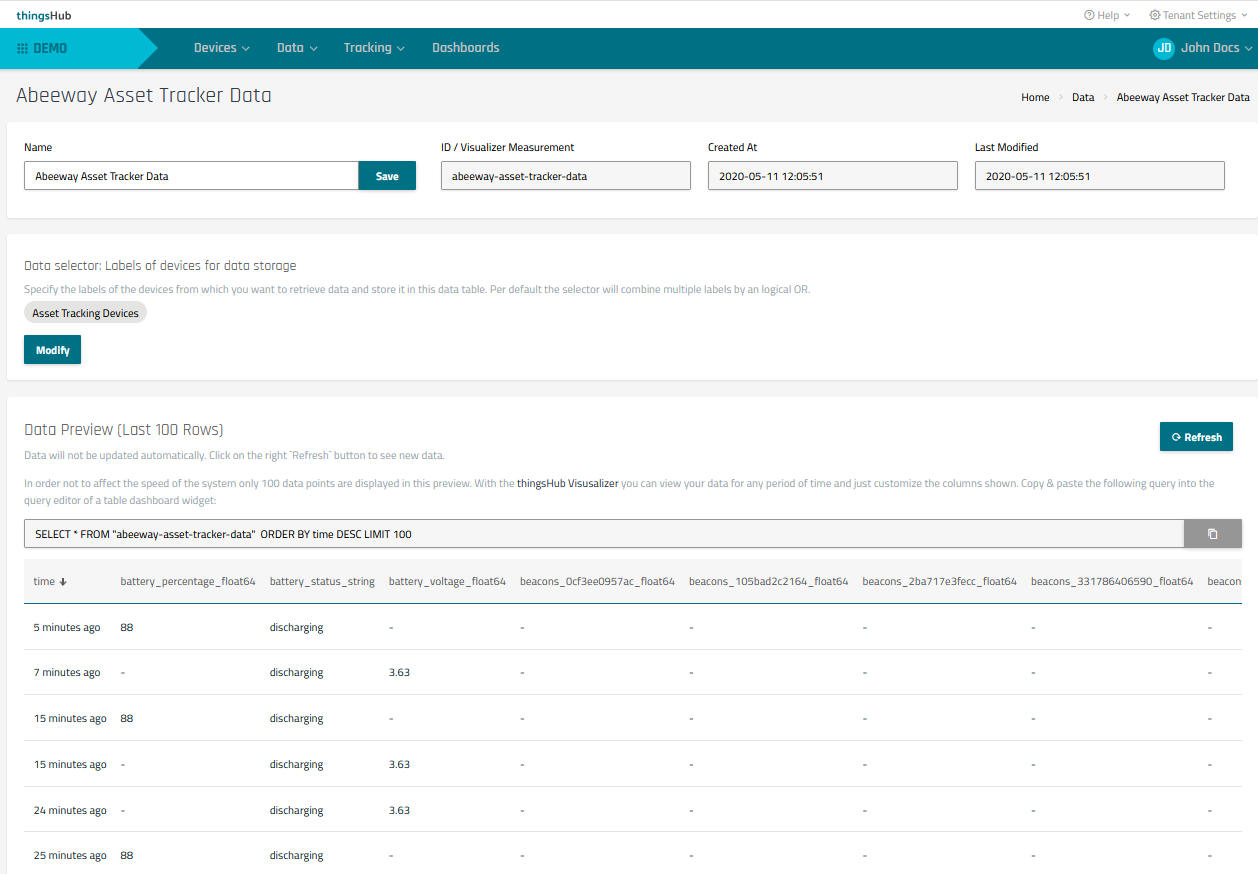 A data table is used to store and display telemetry data from devices that have been grouped according to assigned labels (common characteristics such as a business process or a location).