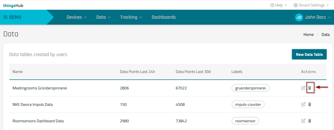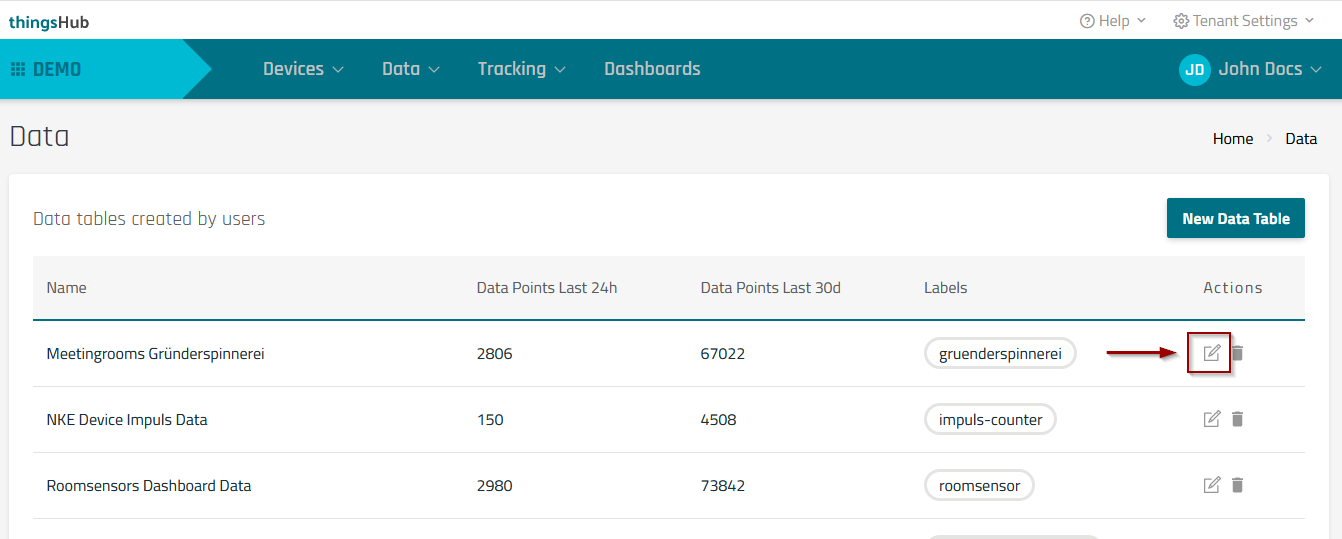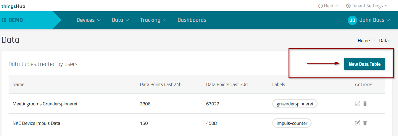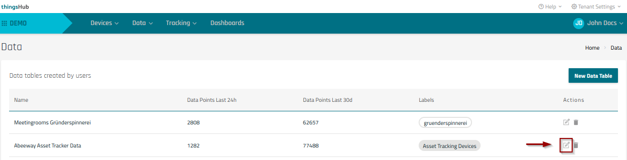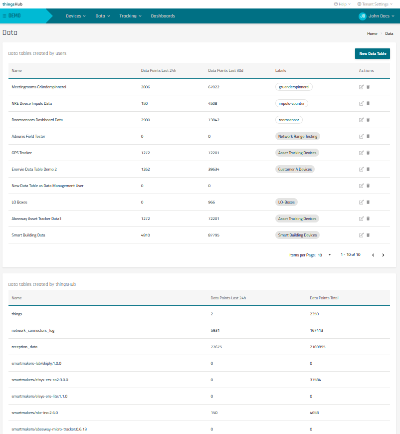 Data tables created by users. The overview list of user-created data tables includes basic information regarding recently received data points and device labels. It also provides access to create a new table, or edit or delete existing tables.