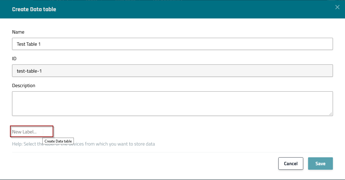 Step 2) In the Create Data table dialog, enter the integration Name, Description (optional), and Labels. Then click Save.