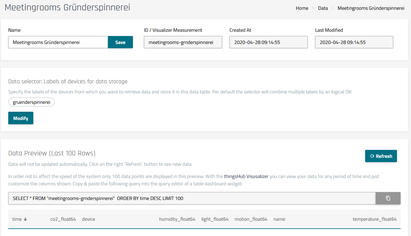 Data tables that have been created automatically by thingsHub. The overview list of tables created by thingsHub includes information regarding recent and total received data points. These tables are managed by the thingsHub and can therefore not be edited. They are for example used as a backing store for the Data tab on the Device Details page or the Network tab on the same page.