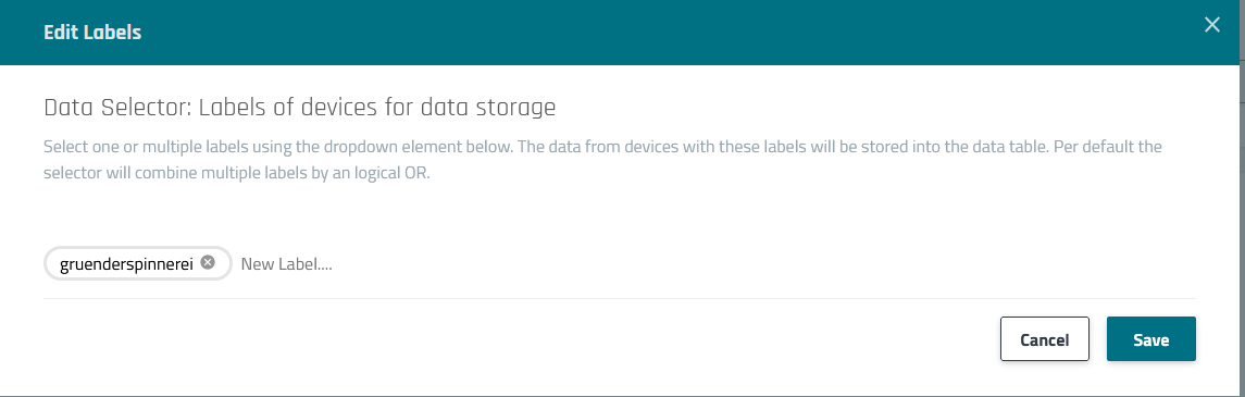 Data selector: Labels of devices for data storage. Use this section to view and specify the labels of the devices from which data is retrieved & stored in this data table. By default, the selector will combine multiple labels by a logical OR.