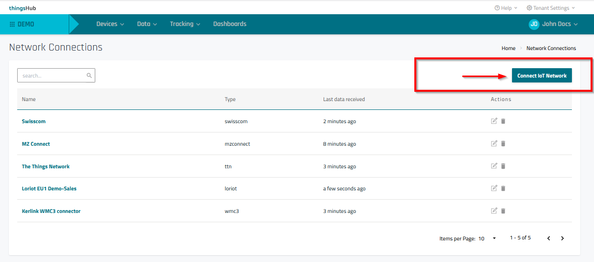5. Connect. Select the IoT Network connector. The thingsHub will automatically register the new device on the selected network.