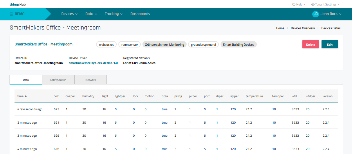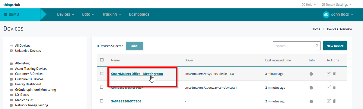 To view the received data, go to Devices > Overview and select the device to open its Device Details page.