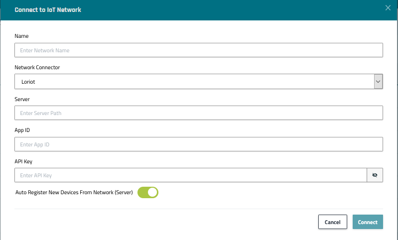 Note: Each connection type has different field requirements. The below example demonstrates the fields required to connect to a Loriot IoT Network. For detailed network configuration information, see IoT network connectors