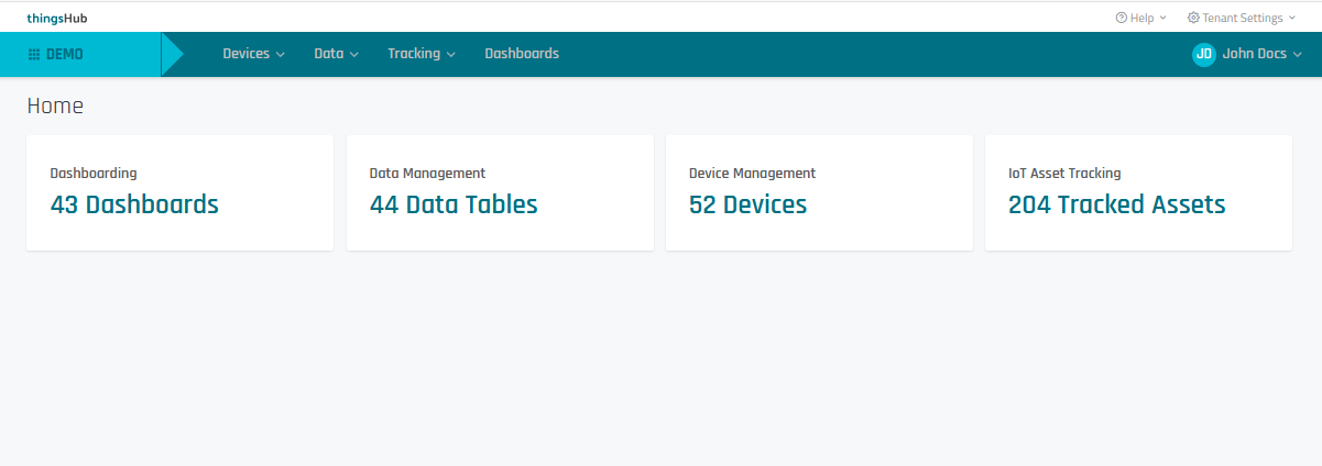 After logging into the thingsHub tenant, users assigned with the Tenant Owner user role will have access to the following homepage: