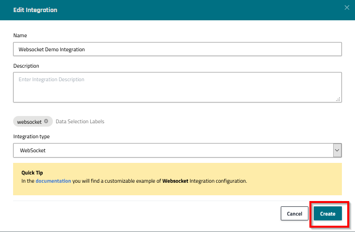 Step 3) In the Edit Integration dialog, you can change the integration name, description, and data selection labels. Save changes by pressing the Create button.