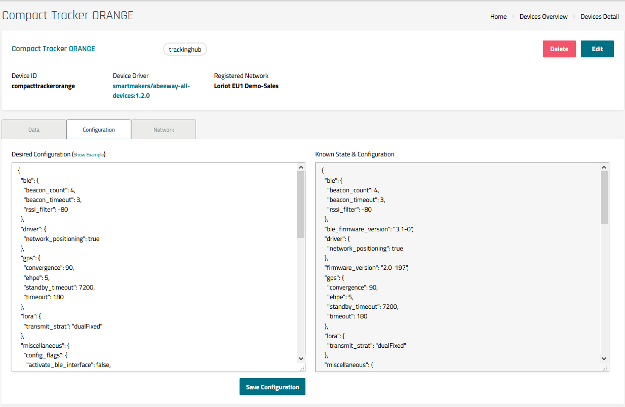 In the Configuration tab of the Devices Details page, you can remotely modify a device configuration by entering new values in the Desired Configuration field and selecting the Save Configuration button. The thingsHub application will then send the configuration down-link to the device.