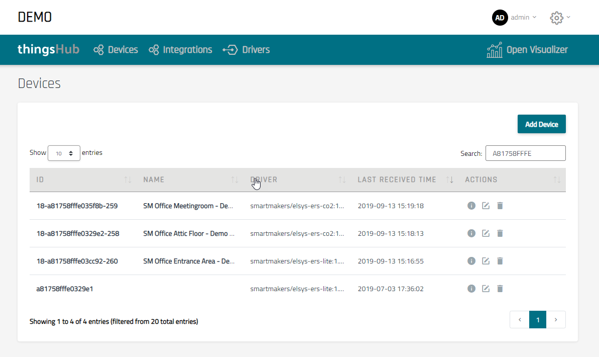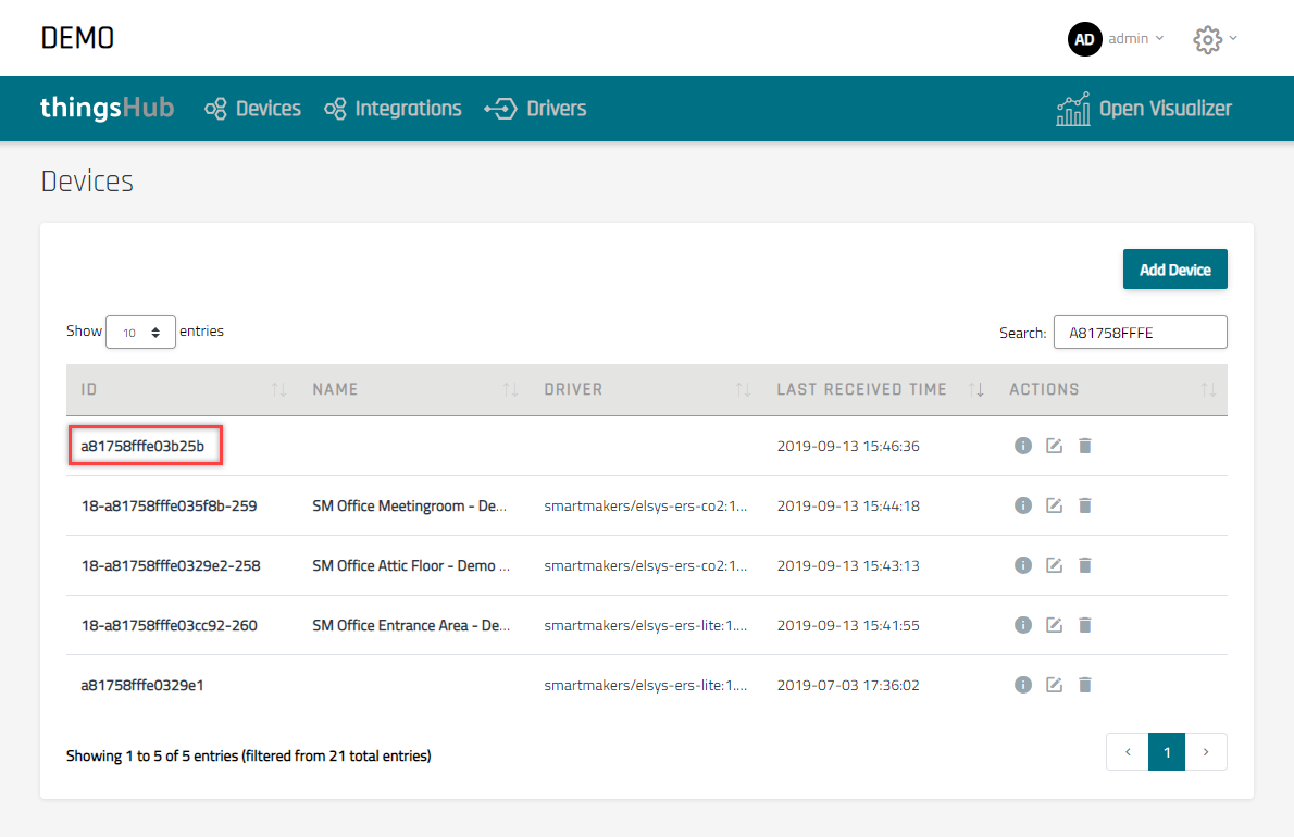 Autoactivation figure 3: After the newly registered device has sent data for the first time, it will automatically appear in the device list in thingsHub. Five instead of four devices are shown.