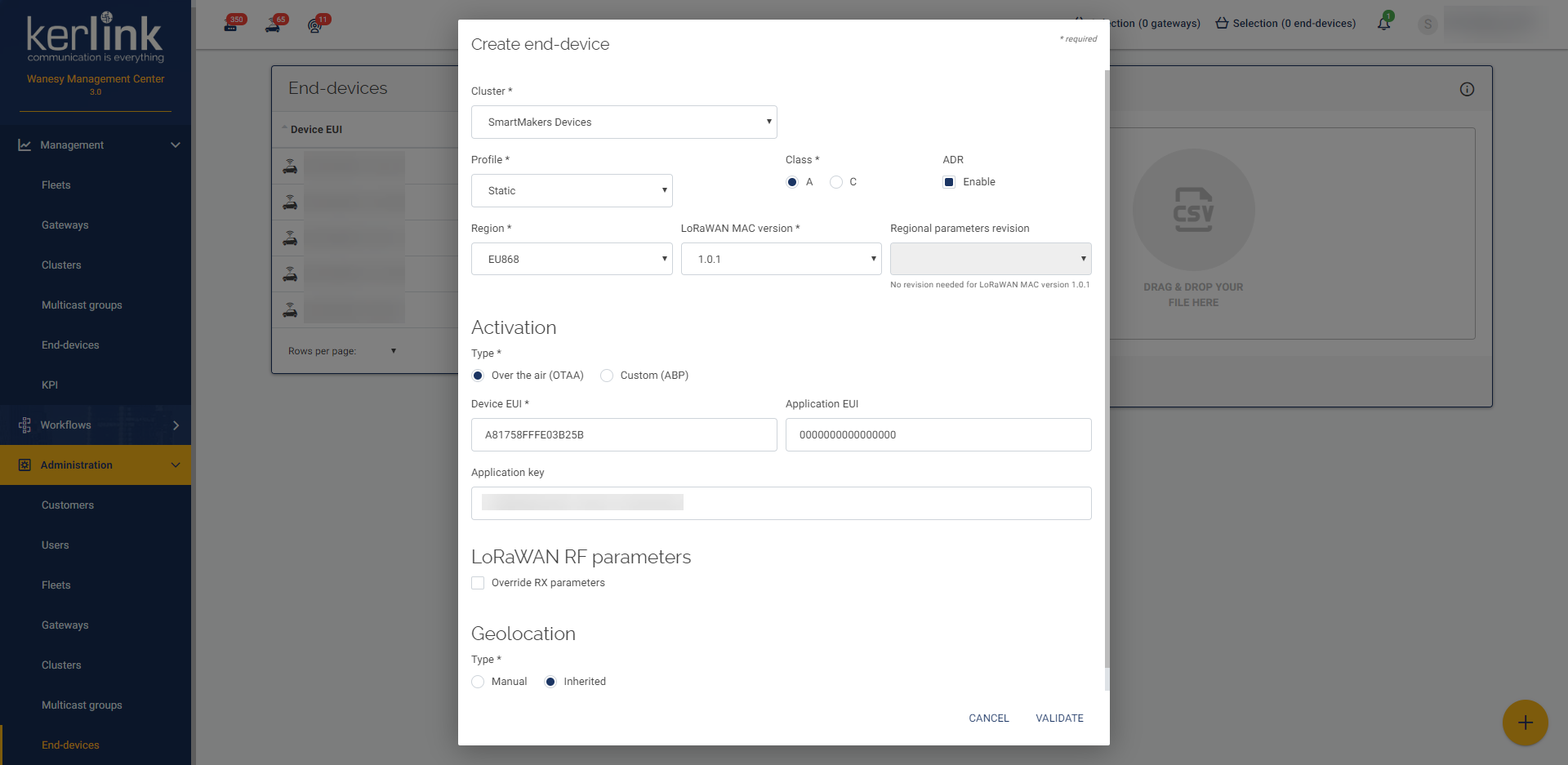 Autoactivation figure 2: a new device is registered in the Waynes Management Center (LoRaWAN Network Server).