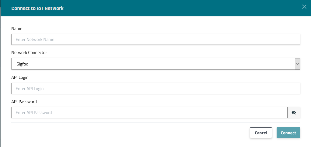 In the Connect to IoT Network dialog, enter information in the fields as described in the parameters table below. Then press the Connect button.
