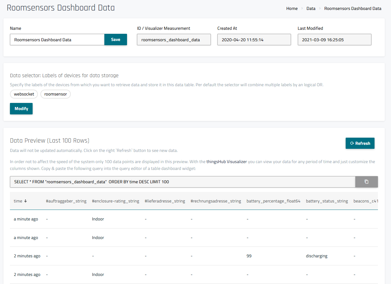 The following screenshot shows a data table created to display and store data from all devices assigned “websocket” & “roomsensor” labels: