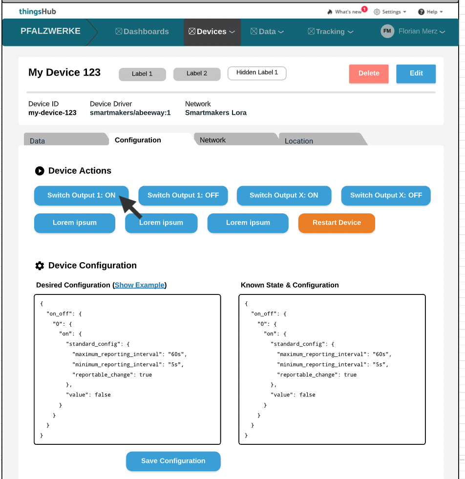 With thingsHub 4.7 so-called "actions" will further simplify the interaction with the device. The outputs of the NKE IN´o can be switched even more easily via “On” and "Off" buttons per Output in the user interface. See the wireframe below: