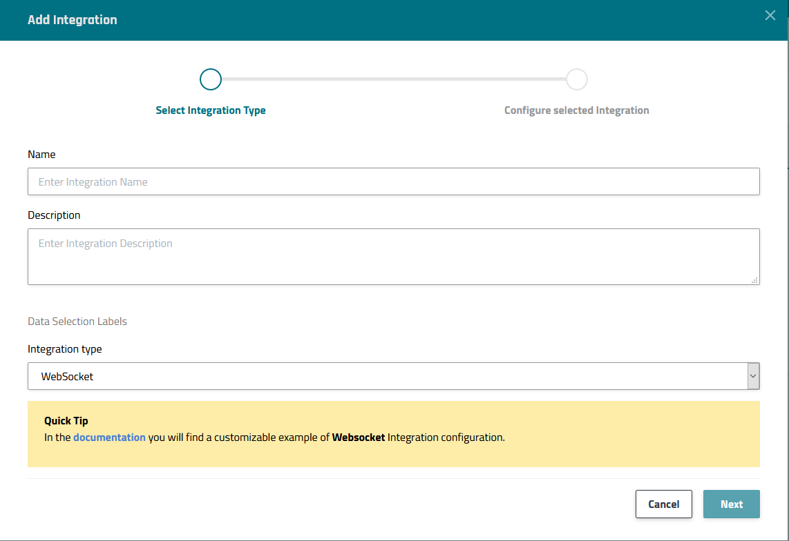 Using the New Integration wizard to set up a websocket integration