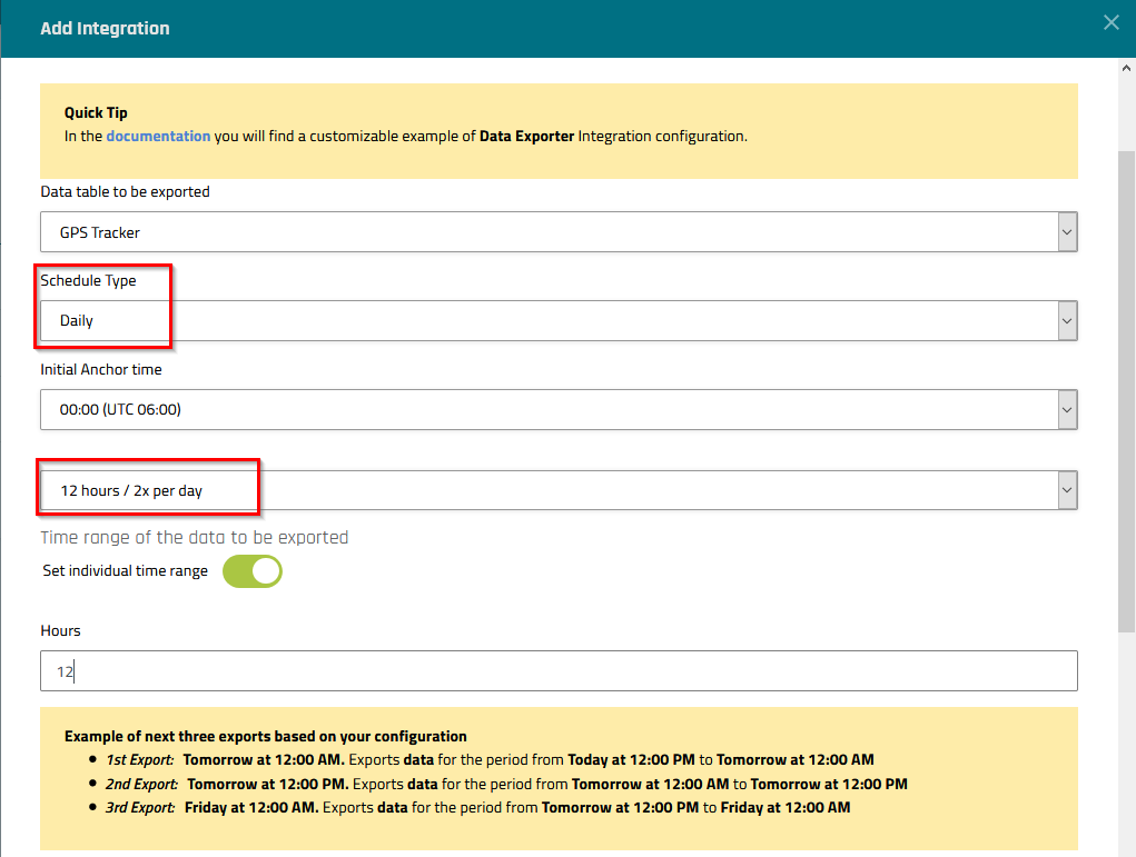 Set individual time range | By default, the time range of the data to be exported is automatically set; it is determined by the daily schedule frequency. However, this toggle switch allows you manually set the time range via the Hours field. This optional can be useful to allow for overlapping time ranges, so that data that is added to a time interval after that interval has already been exported, will be exported with the following export. |