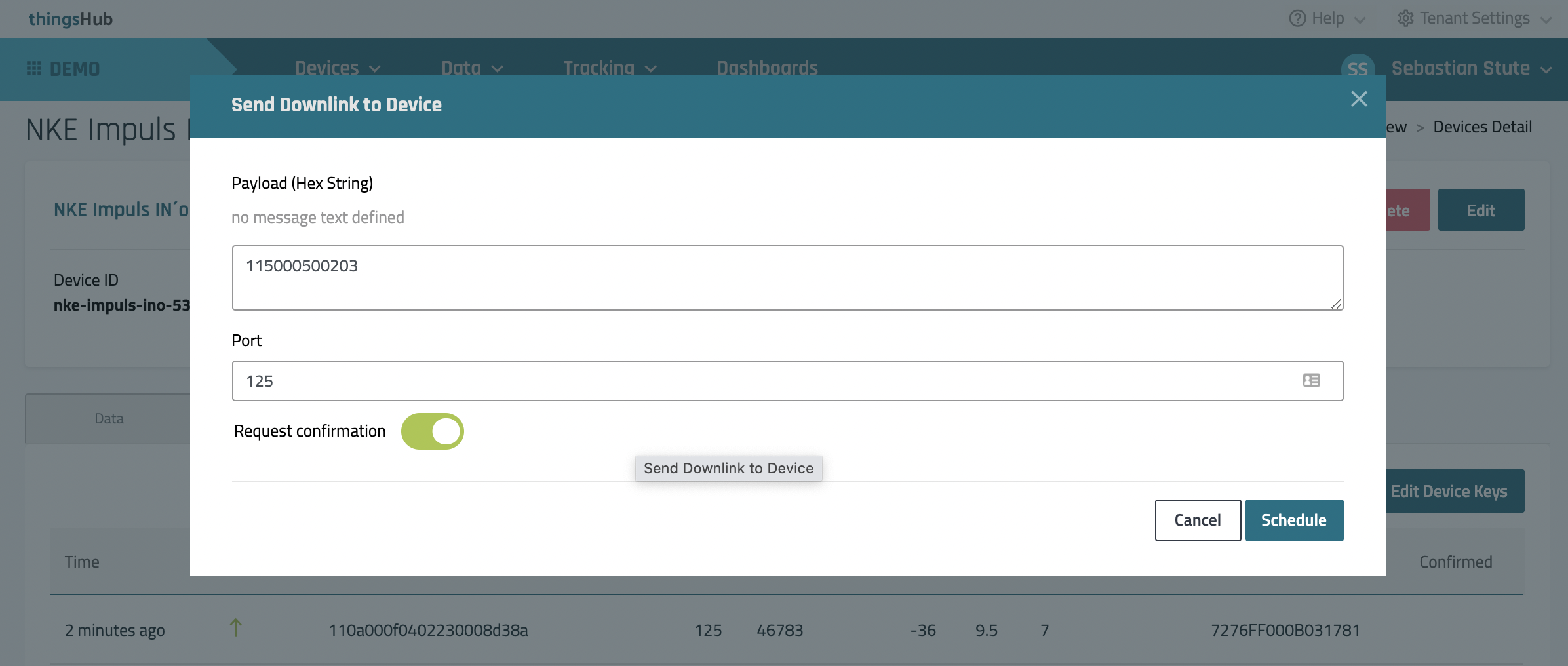 Please send the following downlink via port 125 using the "Send Downlink" function on the device detail page in thingsHub: