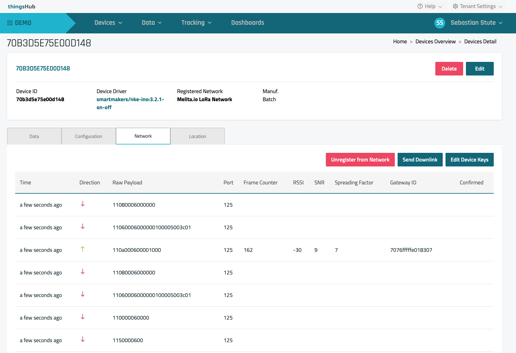 After the downlink have been successfully schedule with your LoRaWAN network server the network table will show the downlink as the first entry: