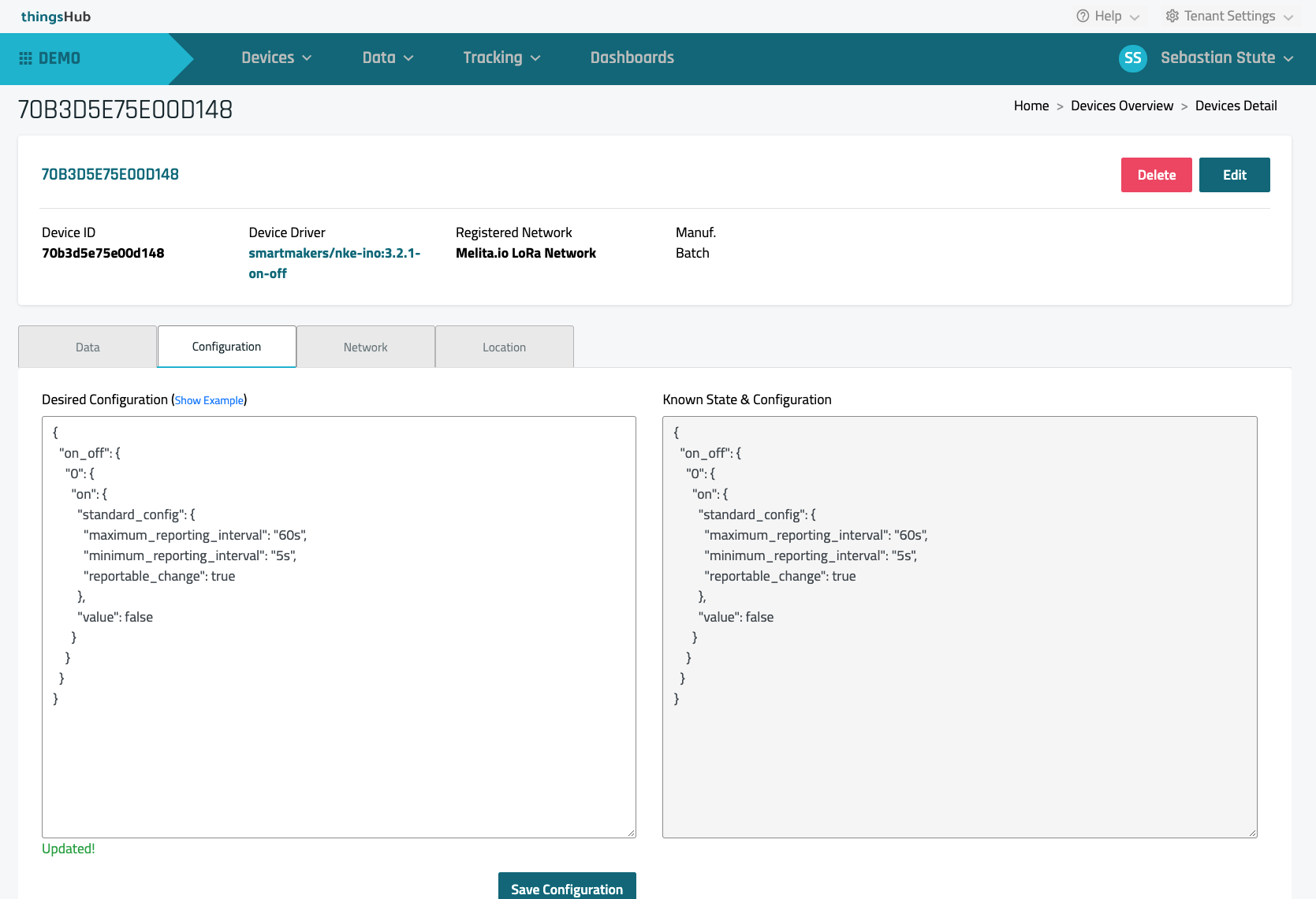 If a configuration is missing even after a long wait: Simply click the "Save Configuration" button again to resend the downlinks of the configuration aspects that are still missing to the device.