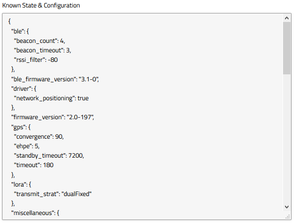 In the Configuration tab of the Devices Details page, you can remotely modify a device configuration by entering new values in the Desired Configuration field and selecting the Save Configuration button. The thingsHub application will then send the configuration down-link to the device.