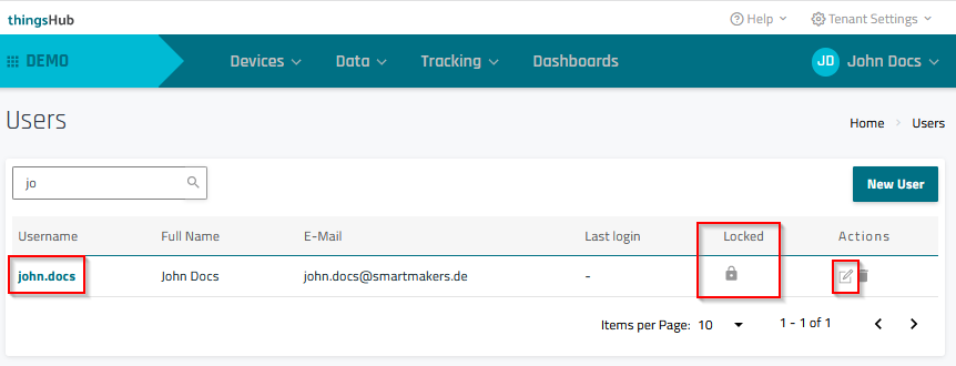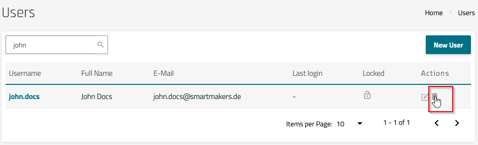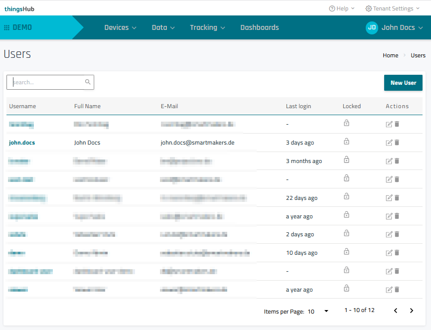 This opens the User Management page, where you can view all current users, as well as when they logged in for the last time, and whether they are locked, i.e. they are not allowed to log in anymore.