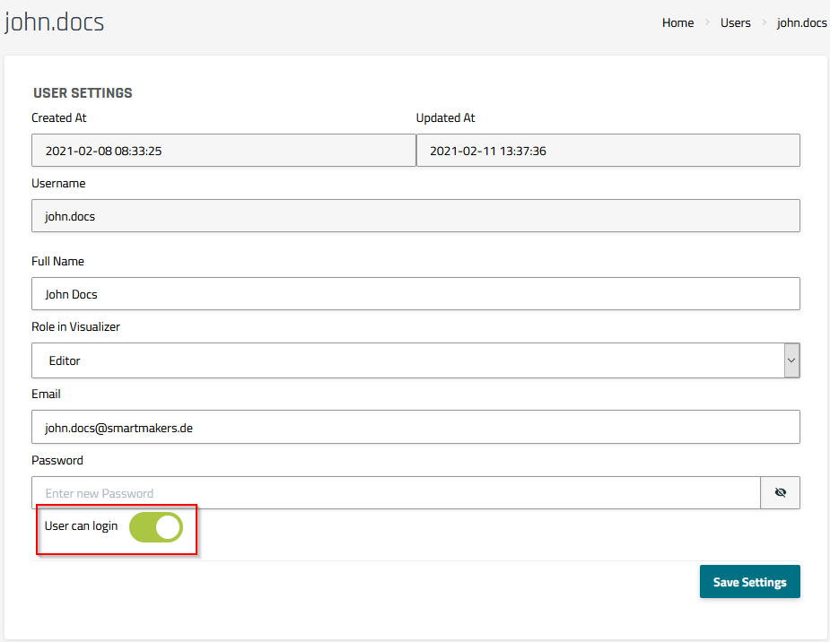 Step 2) Switch the User can login toggle to the green setting to unlock the account.