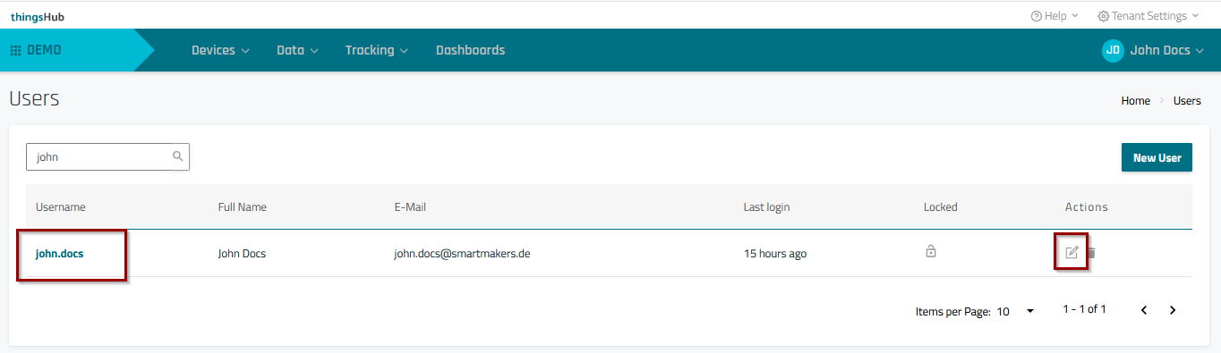 Step 1) From the User Management page, select the Username or Edit button to open the User Settings and Roles page.
